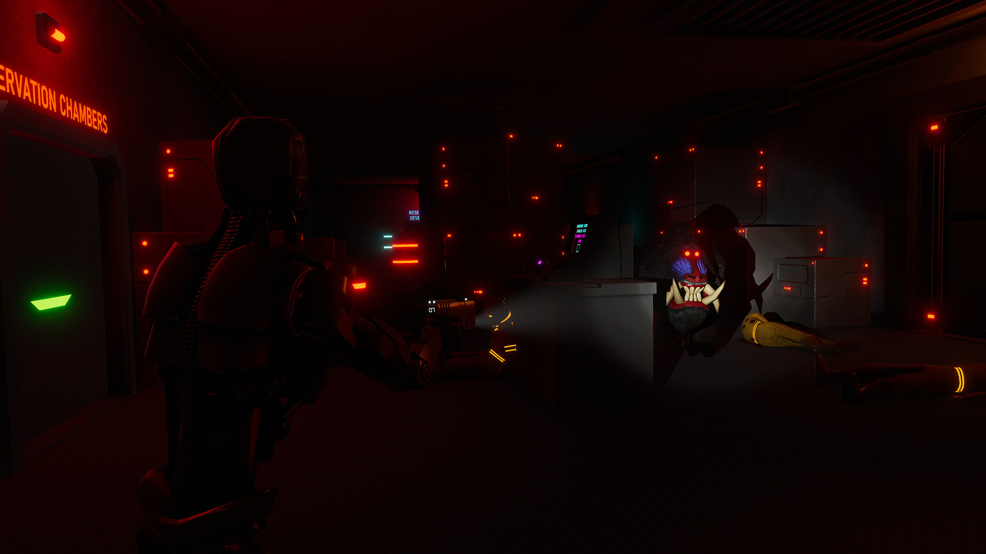 另一方面,最多兩名 PC 玩家能加入遊戲,選擇協助 VR 玩家操控友軍無人機,或是直接扮演敵對的 Mandrillians 追捕對方。作為敵方時,PC 玩家可運用「猴子感官」追蹤 VR 玩家,透過通風口快速移動,甚至利用軍事化強化來提升戰力,營造心理壓迫感。