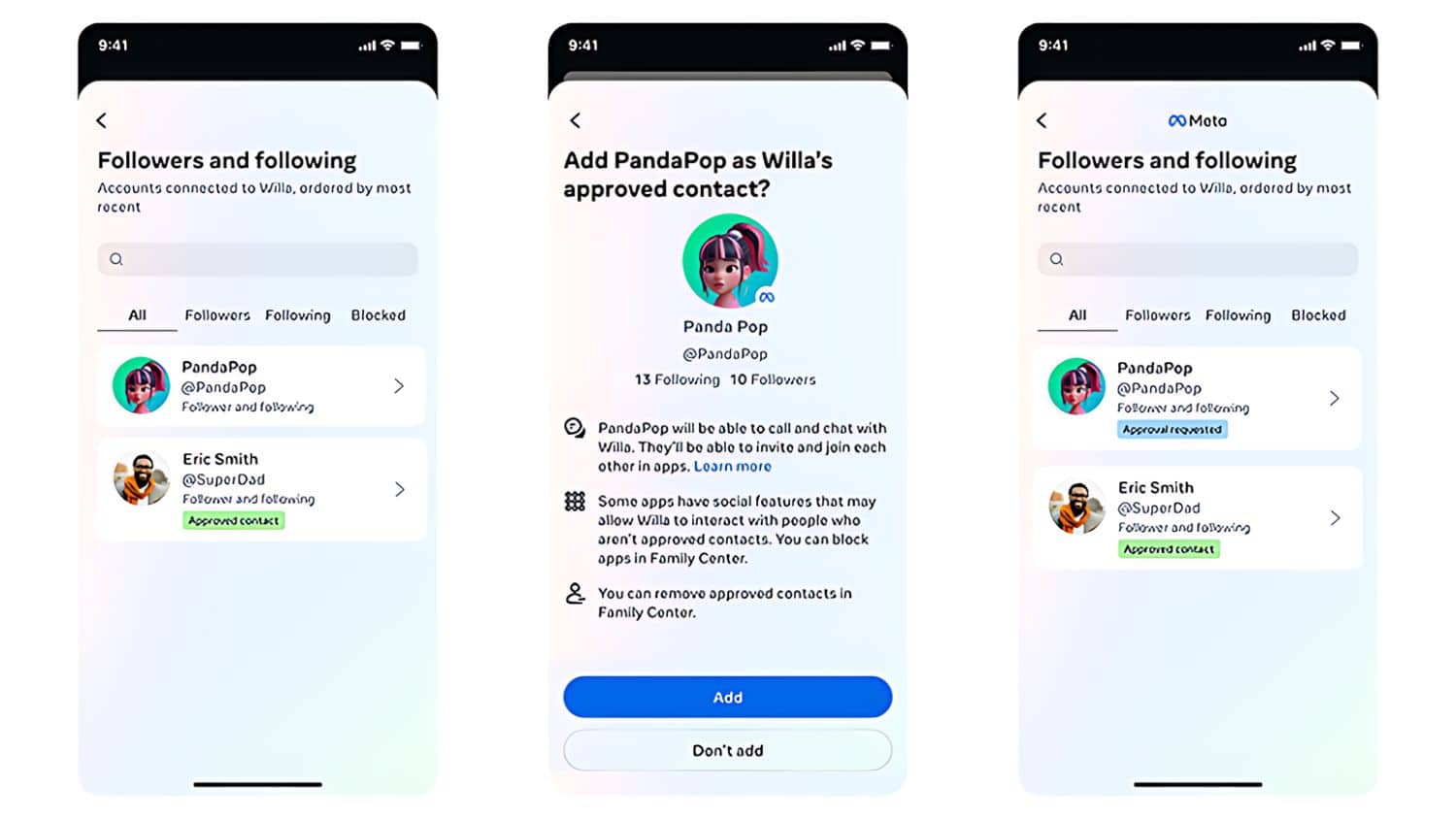 - 青少年可以請求將粉絲變成經批准的聯絡人。一旦家長添加了這些聯絡人,青少年就可以與他們聊天、通話,並發送或接受邀請參加經家長批准的多玩家MR或VR體驗。