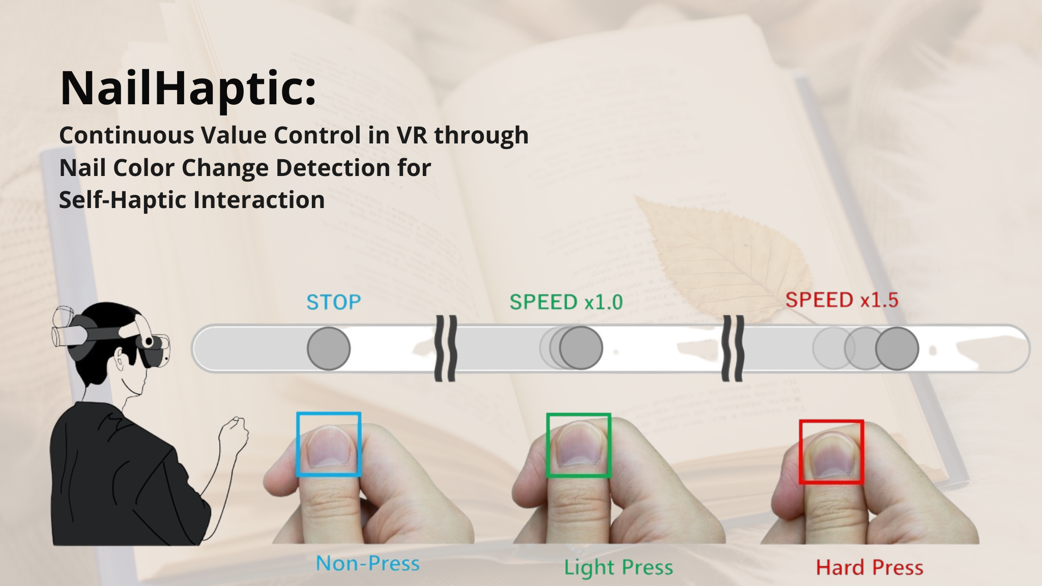 在虛擬實境的自由手勢操作中,用戶通常依靠雙手進行輸入,但缺乏觸覺回饋,導致連續值操作如音量或滑桿調整變得困難。NailHaptic 的核心想法是使用單手捏合手勢,讓拇指與食指的壓力變化作為輸入依據,並透過 RGB 相機與 機器學習模型辨識不同的壓力層級。研究團隊建立了數據集並以深度學習訓練模型,最終能區分三種壓力等級:無壓力、輕壓與重壓,並實現 即時壓力判斷。